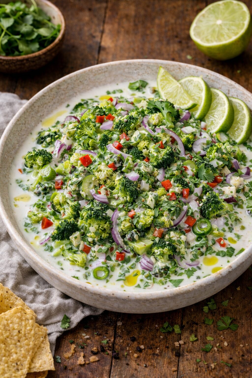 Pour le dressage, disposez la sauce coco au fond de l’assiette, ajoutez le brocoli mariné